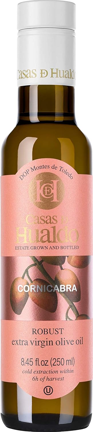 Denn elegante Ekstra Jomfru Olivenolie fra Casas de Hualdo er lavet på olivensorten Cornicabra, med beskyttet oprindelse i Montes de Toledo nær Madrid.